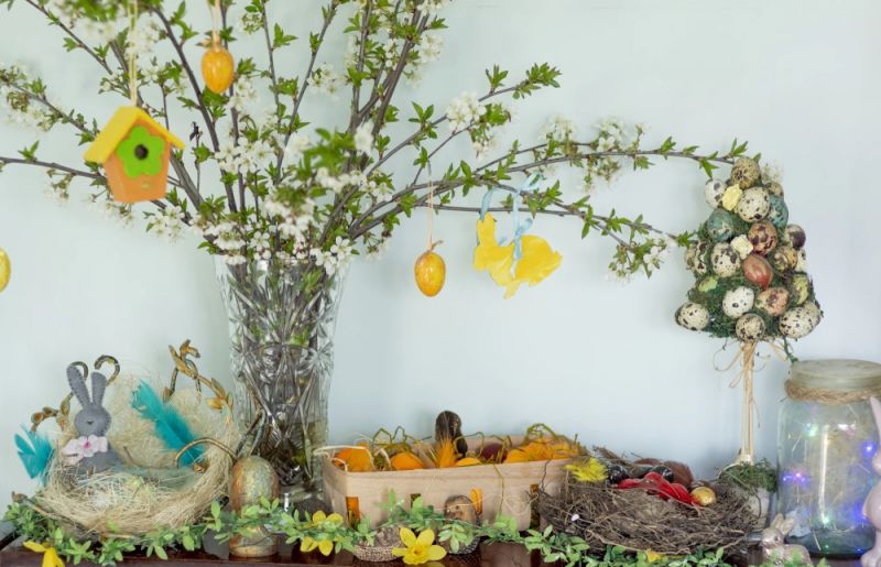 If you love natural decorations, this is a fun thing to do! The next time you are going out for a walk or from your garden, pick up some twigs and small fallen branches. When you get home, use your painted eggs or perhaps feathers and ribbons to hang from the small branches in a vase. Place the twigs at the bottom of the vase, then stand a larger brach upright so you can use string to tie your decorations to. You can do this for a table piece or go big!